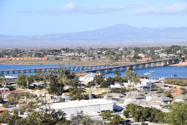 The lookout looks over the gulf and over to the Flinders Ranges , in the photo is the end of a train - about 120 carriages sitting & waiting for the signals to change .
