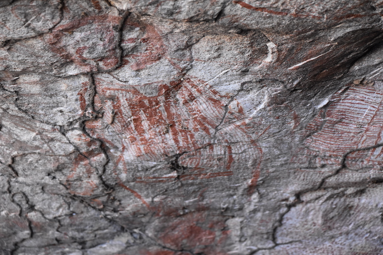 Next stop was Bardi Beach - a swim for some and a rock hop up to some more art sites for those agile enough .