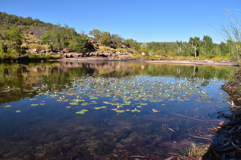The walk took us up the creek , crossing it a couple of times before going up to a rocky outcrop where we found more rock art . The creek looked beautiful .