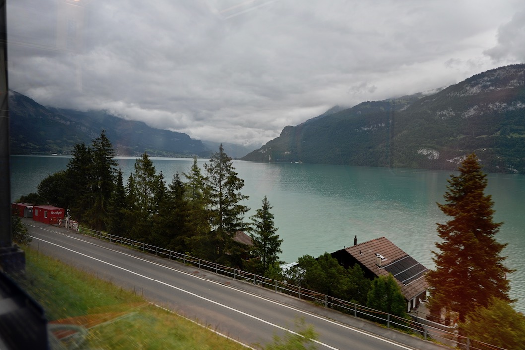 Today we leave Interlaken , and go to Lucerne . Again , we are travelling by train , so we're up fed and watered , ready to go , so head down to the bus stop and catch the bus to the train station . We had a little bit of time to wait before the train arrived . We boarded and got a couple of good seats with a view , most have large viewing windows on this train , and for good reason . The line follows the edge of Lake Brienzersee down to Brienz . Here's some of the scenery along the way , looking toward Brienz .